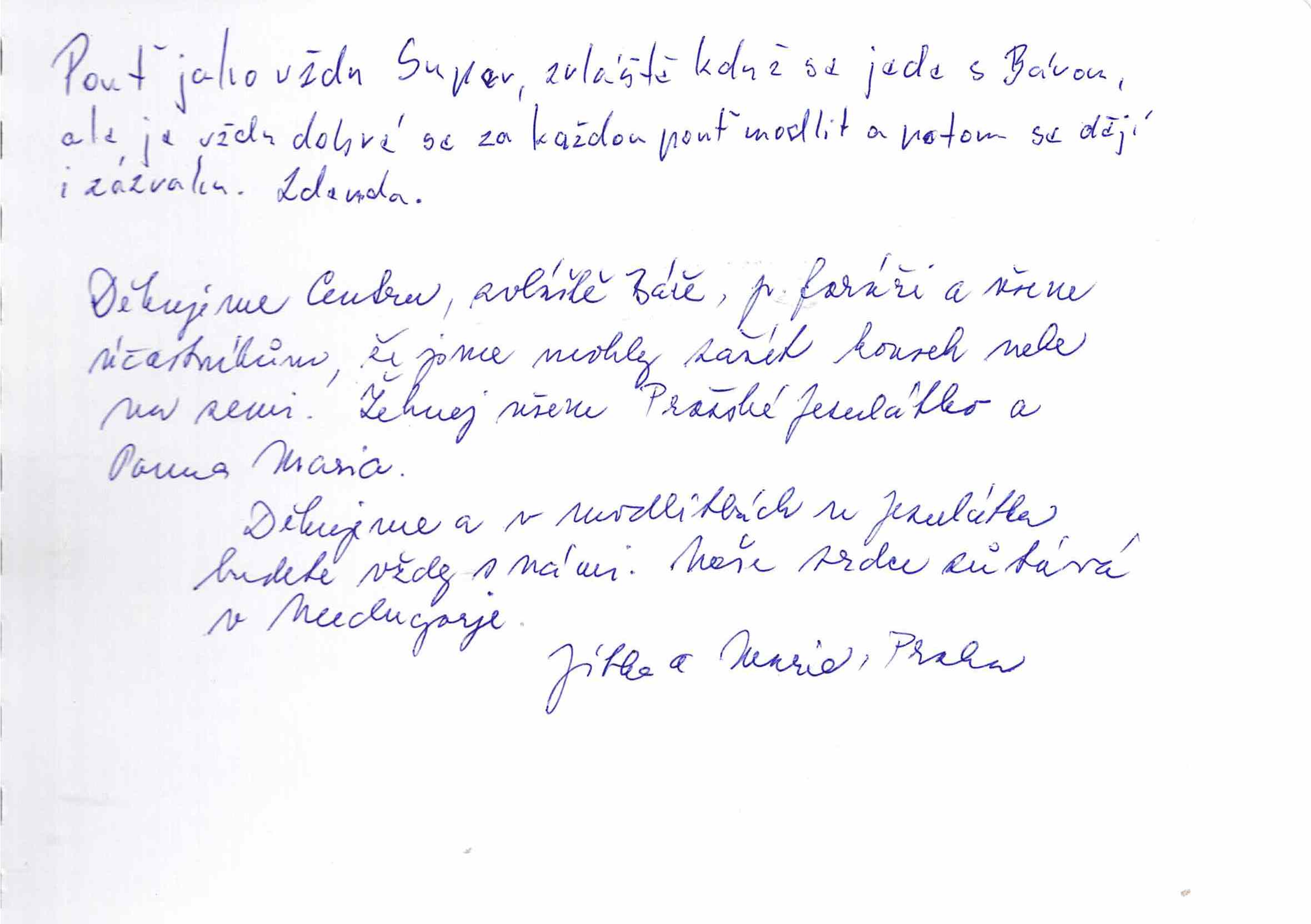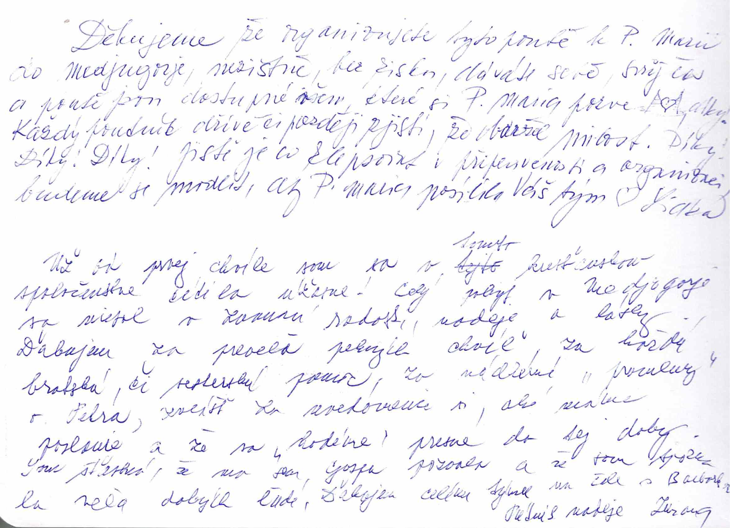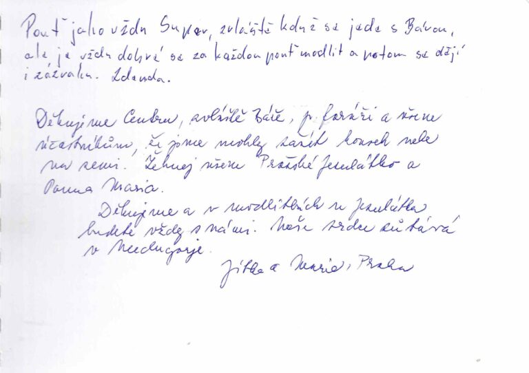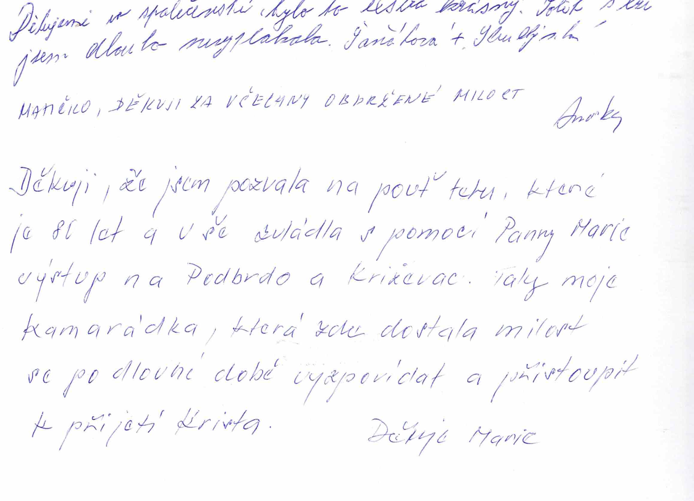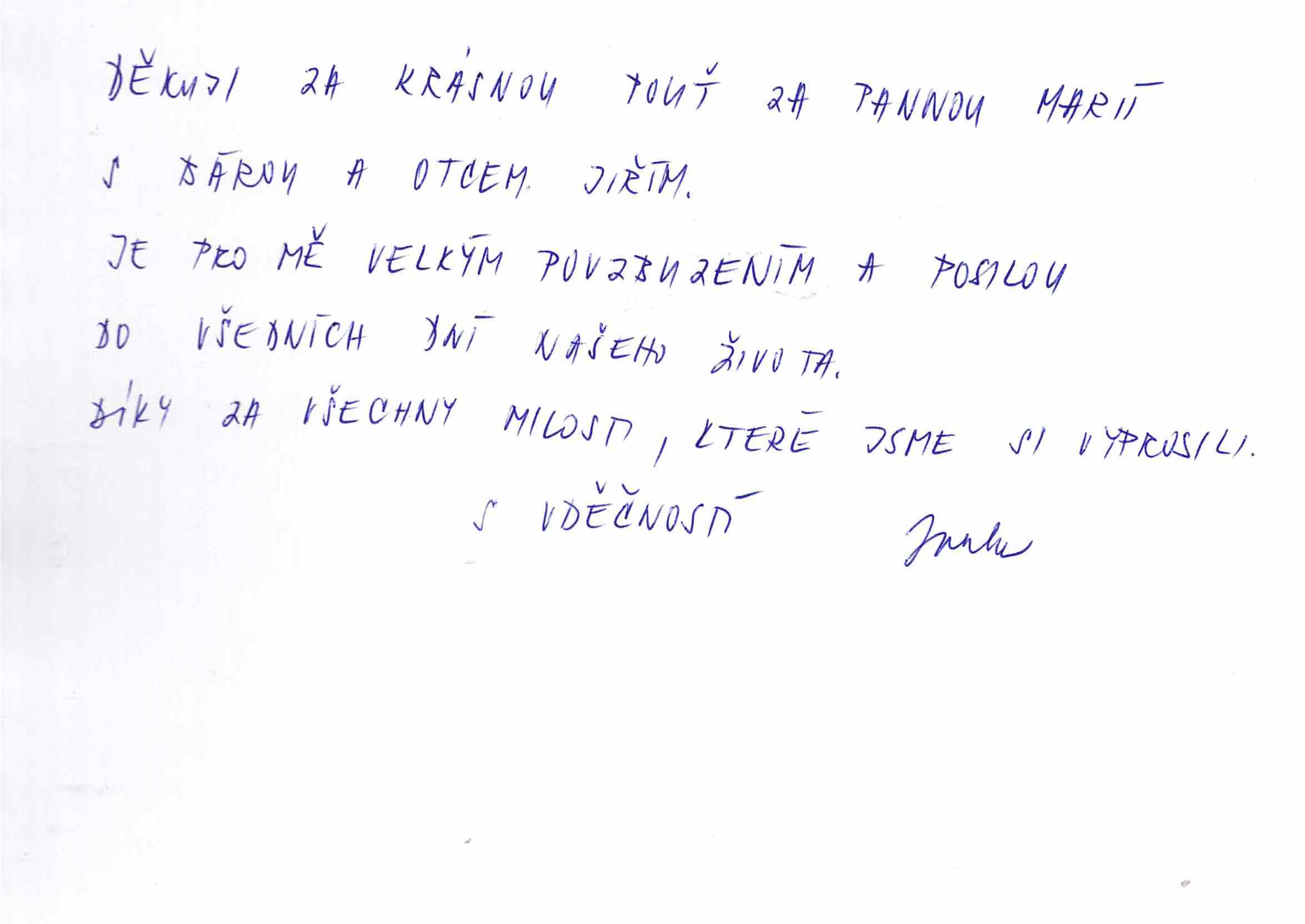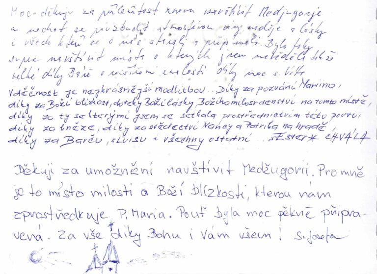 Ještě jednou bych Vám ráda poděkovala za skvělou pouť do Medjugorje. Když na to myslím, vnímám velkou radost a vděčnost. Ať Vám Pán žehná a Panna Maria ať Vás chrání a drží ochranný plášť nad vaším společným dílem.