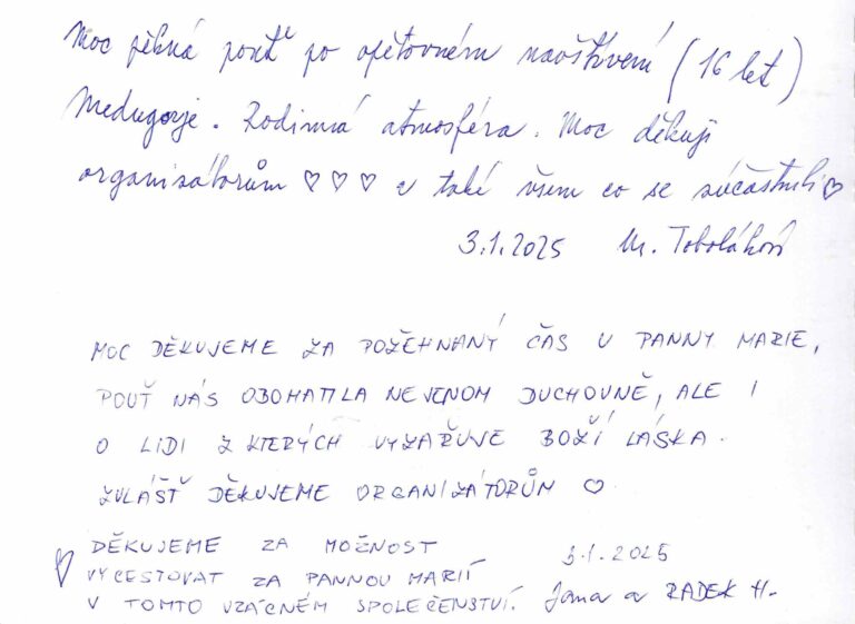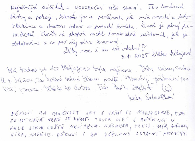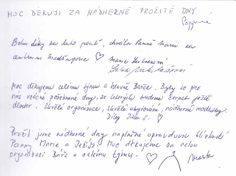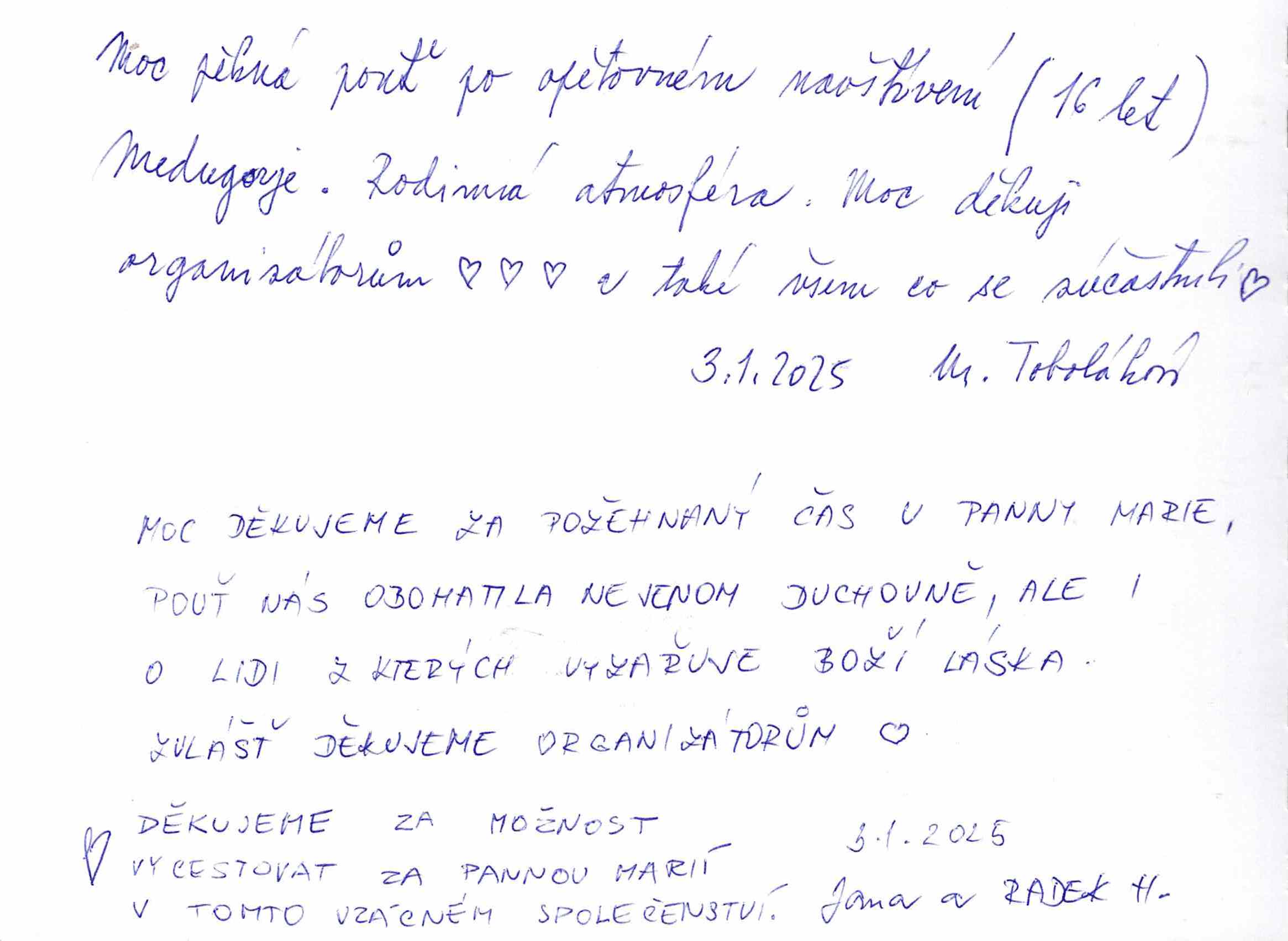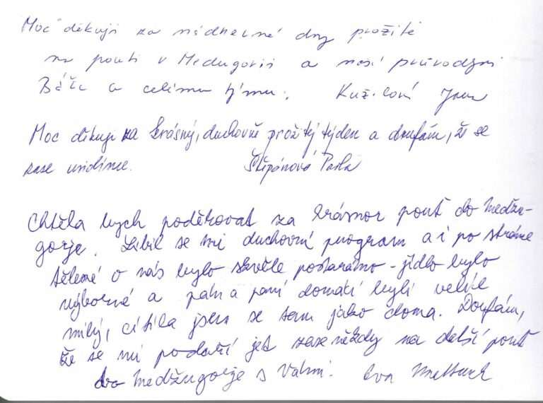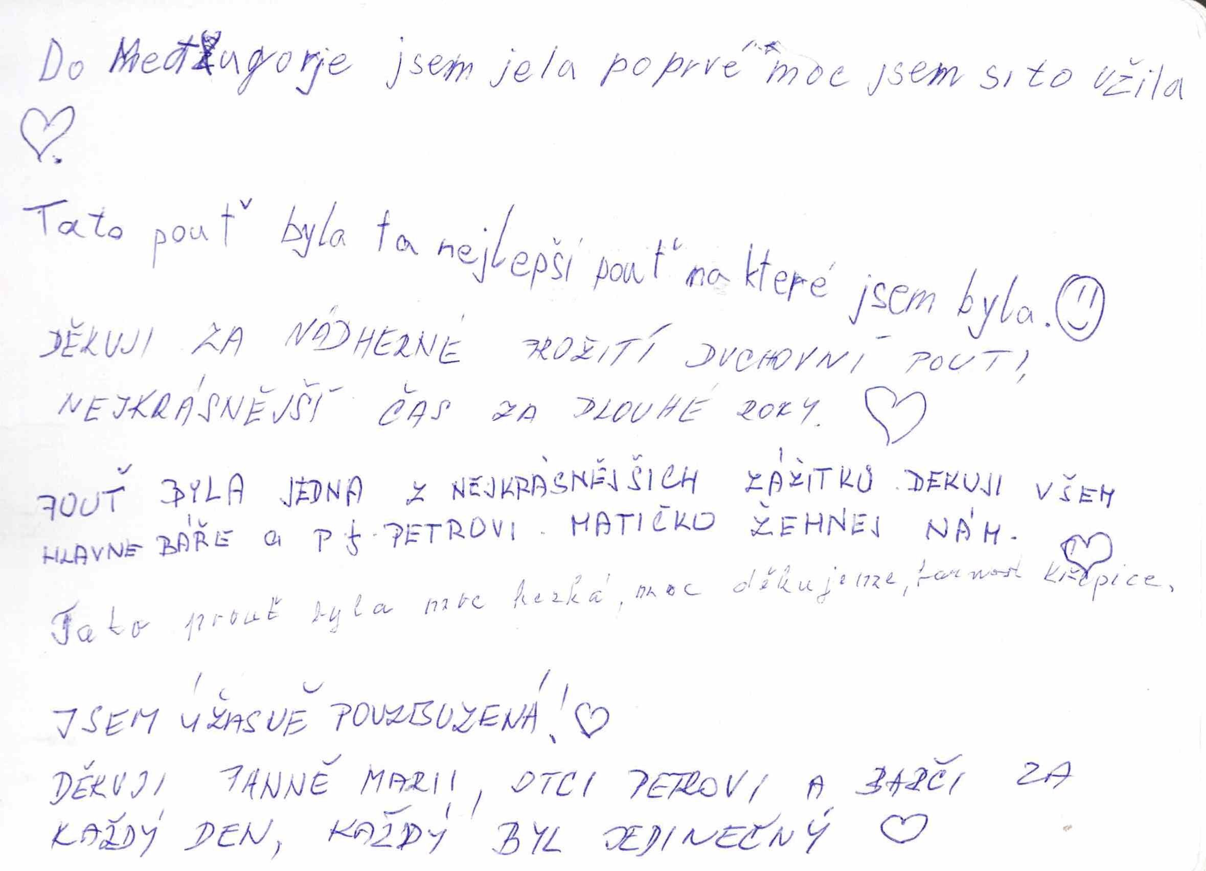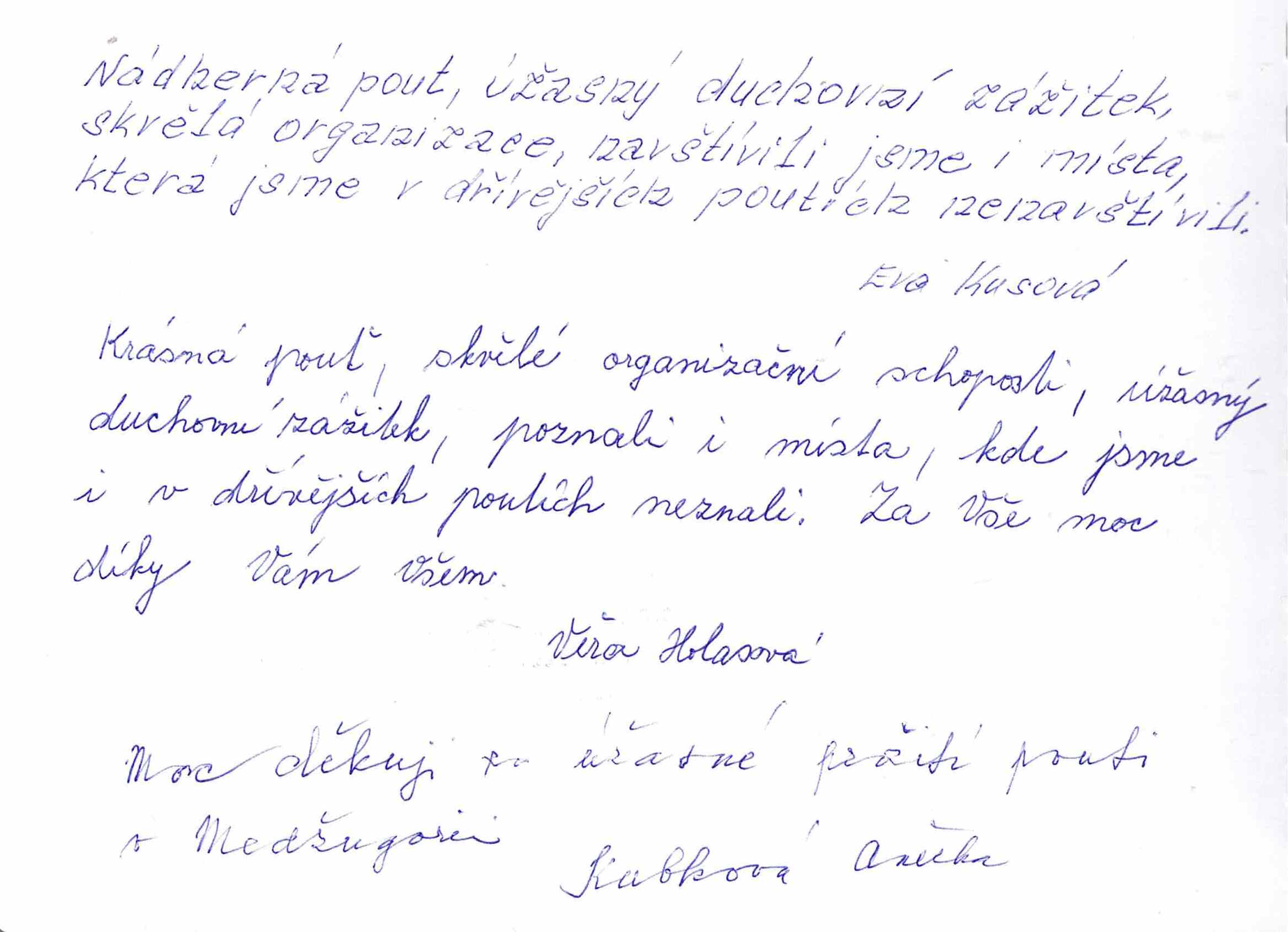Ještě jednou bych Vám ráda poděkovala za skvělou pouť do Medjugorje. Když na to myslím, vnímám velkou radost a vděčnost. Ať Vám Pán žehná a Panna Maria ať Vás chrání a drží ochranný plášť nad vaším společným dílem.
