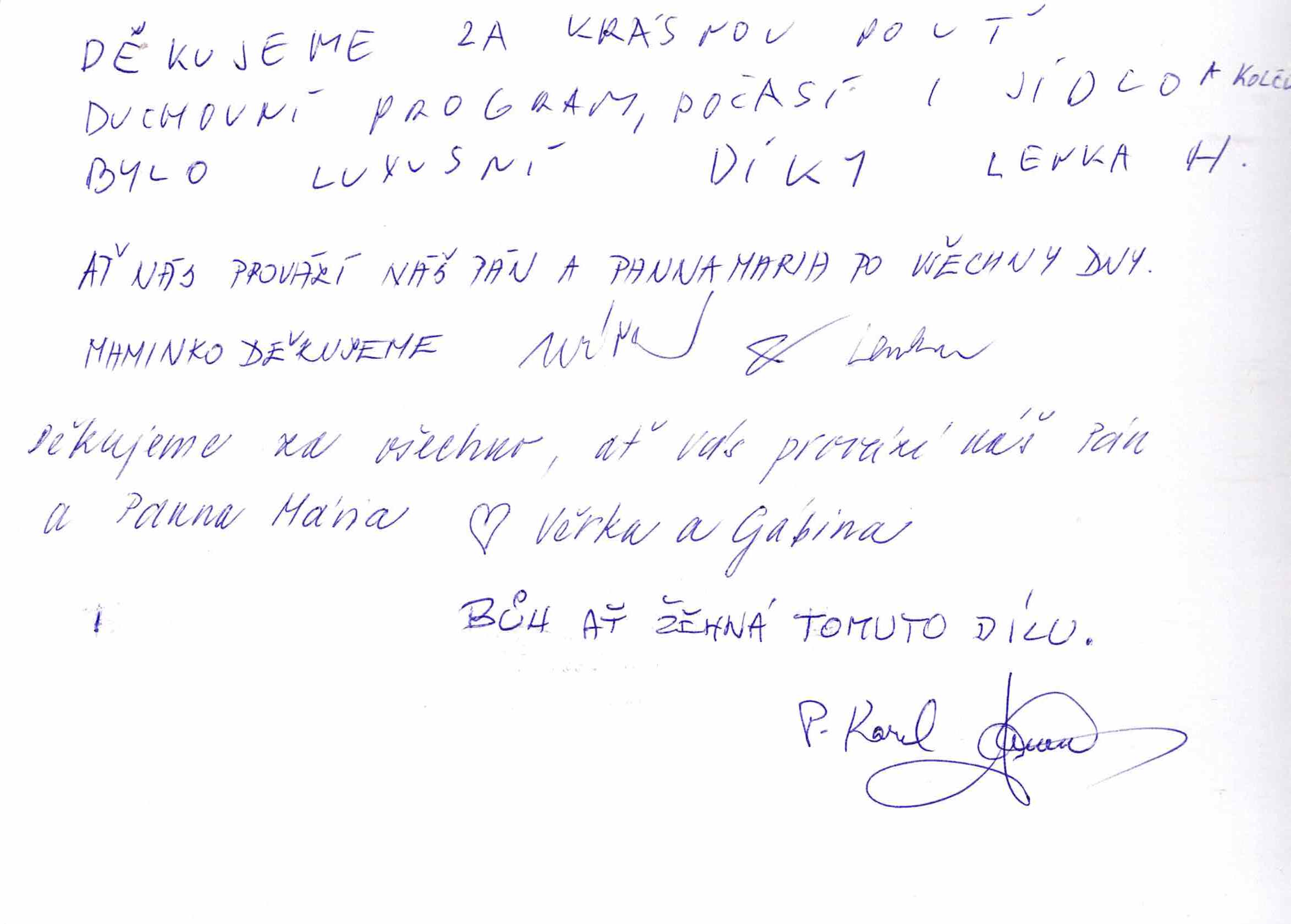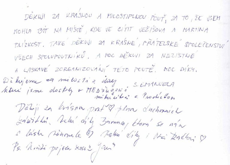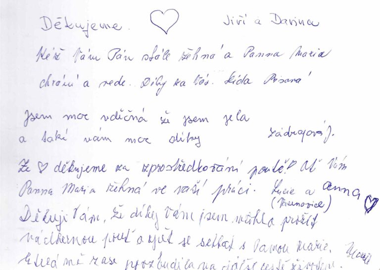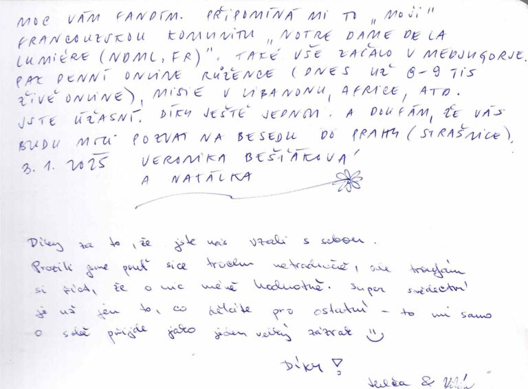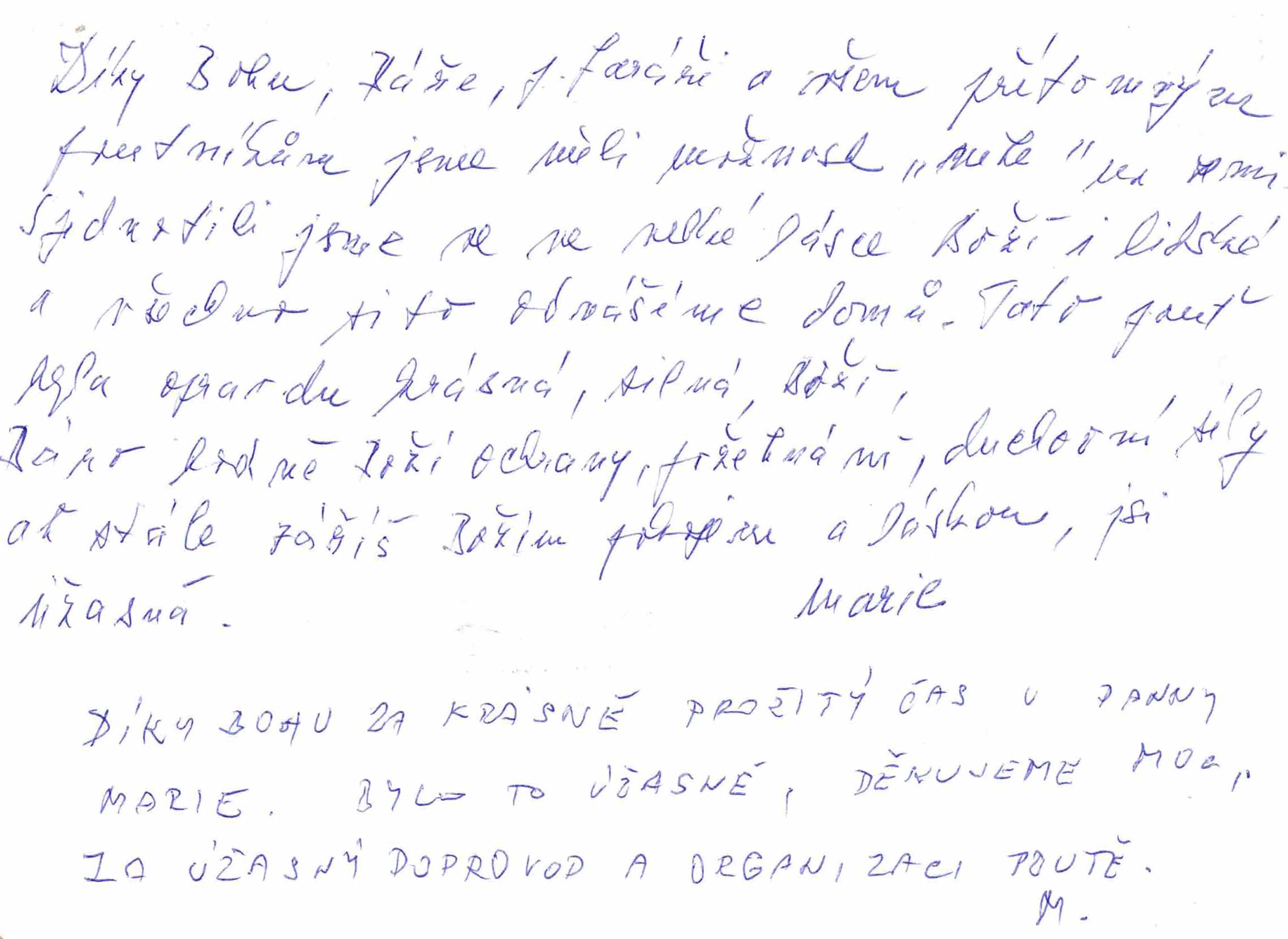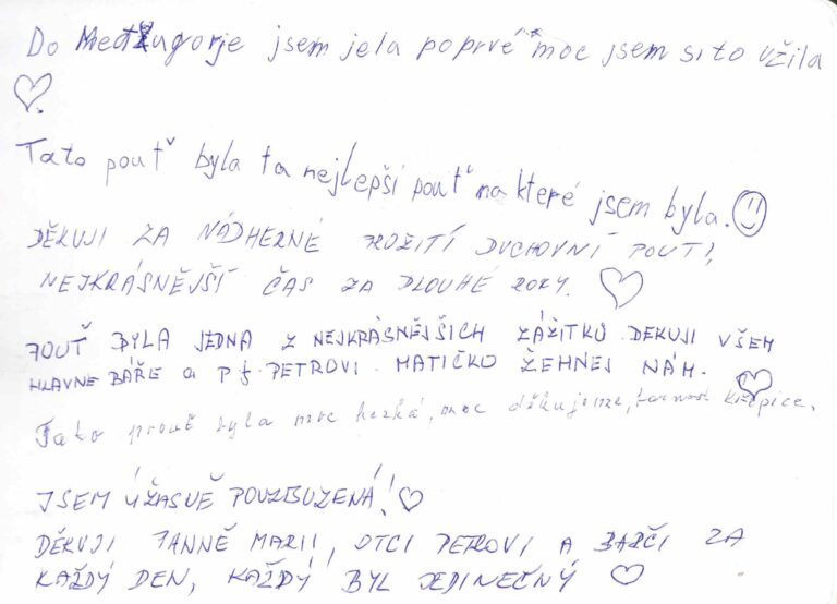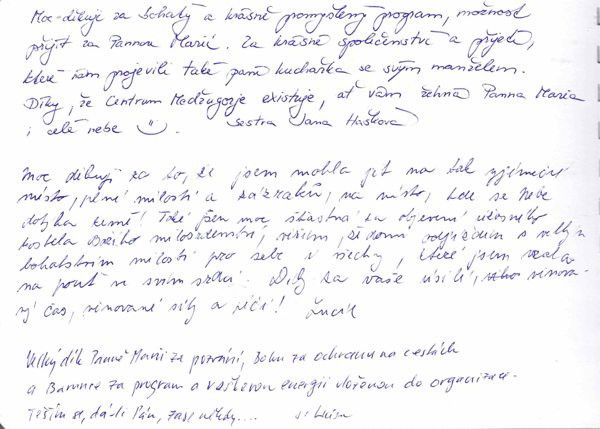 Ještě jednou bych Vám ráda poděkovala za skvělou pouť do Medjugorje. Když na to myslím, vnímám velkou radost a vděčnost. Ať Vám Pán žehná a Panna Maria ať Vás chrání a drží ochranný plášť nad vaším společným dílem.
