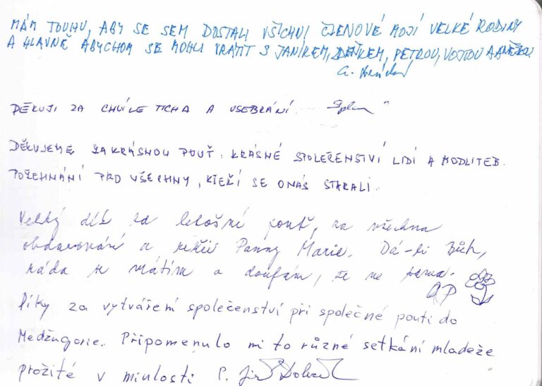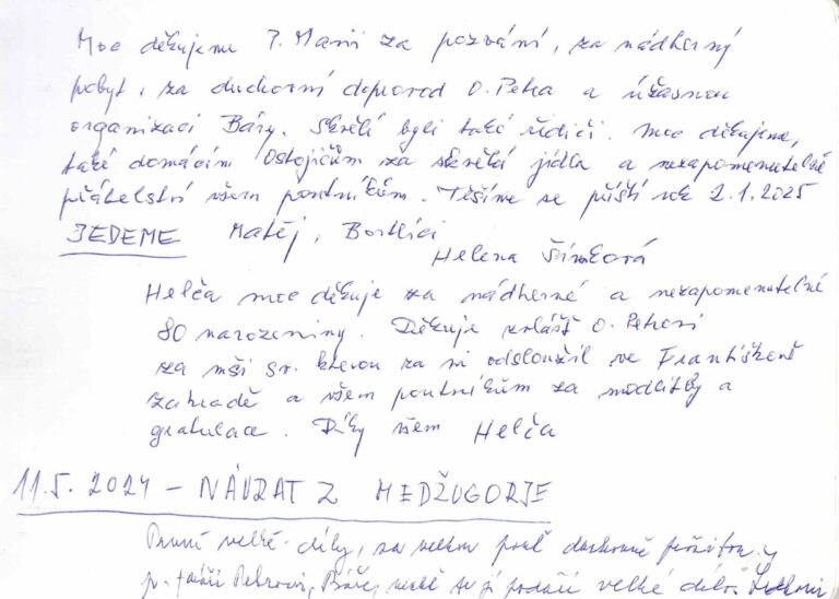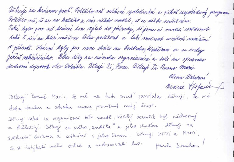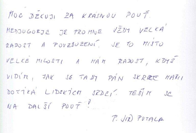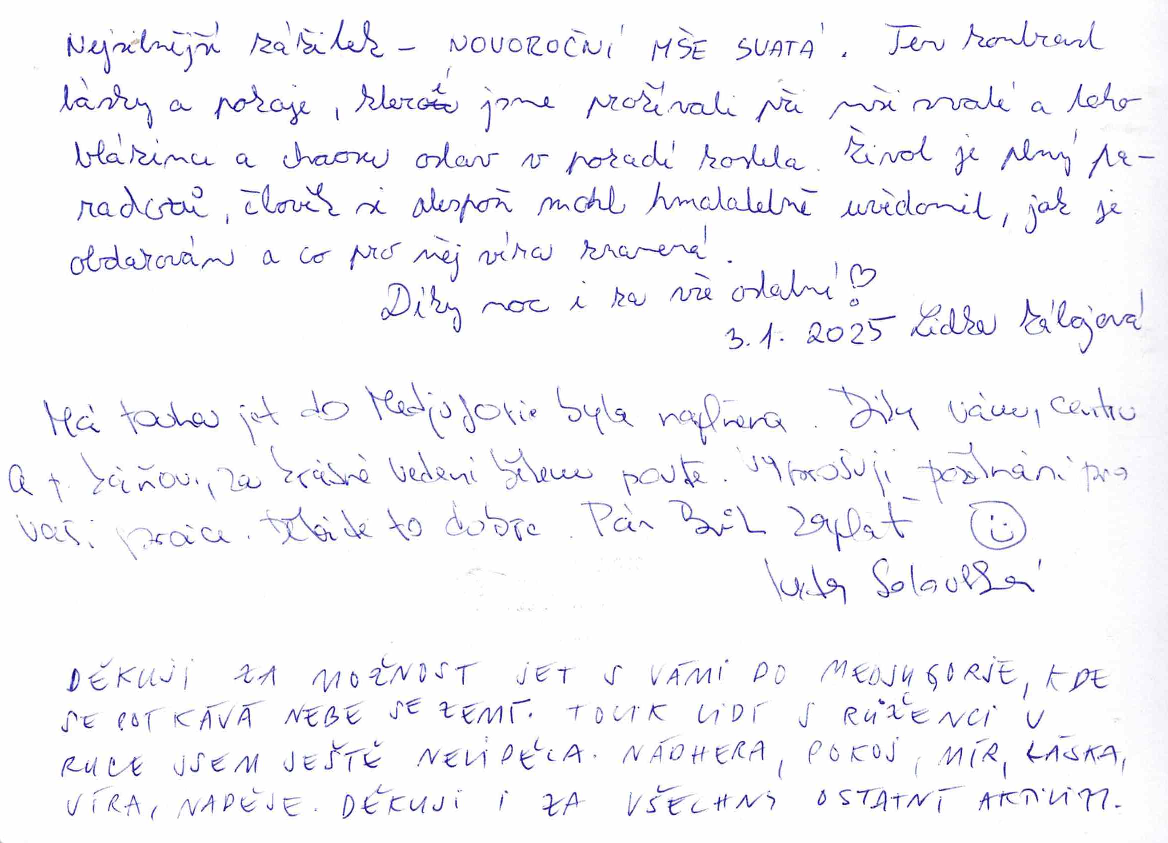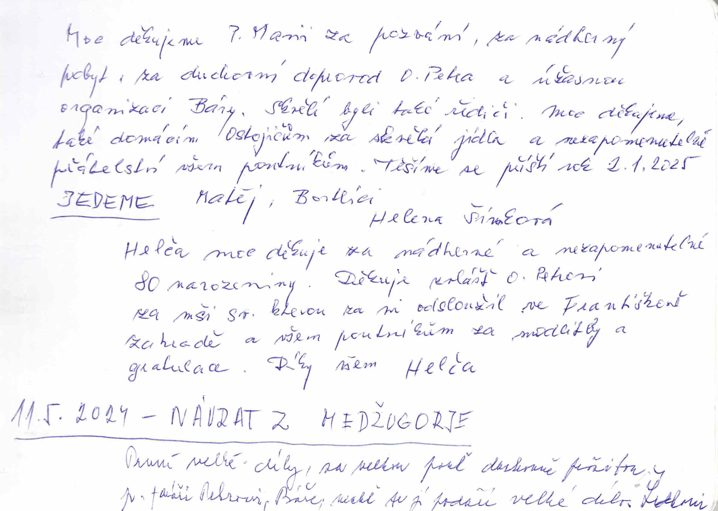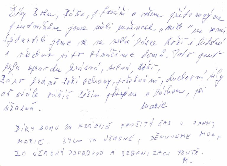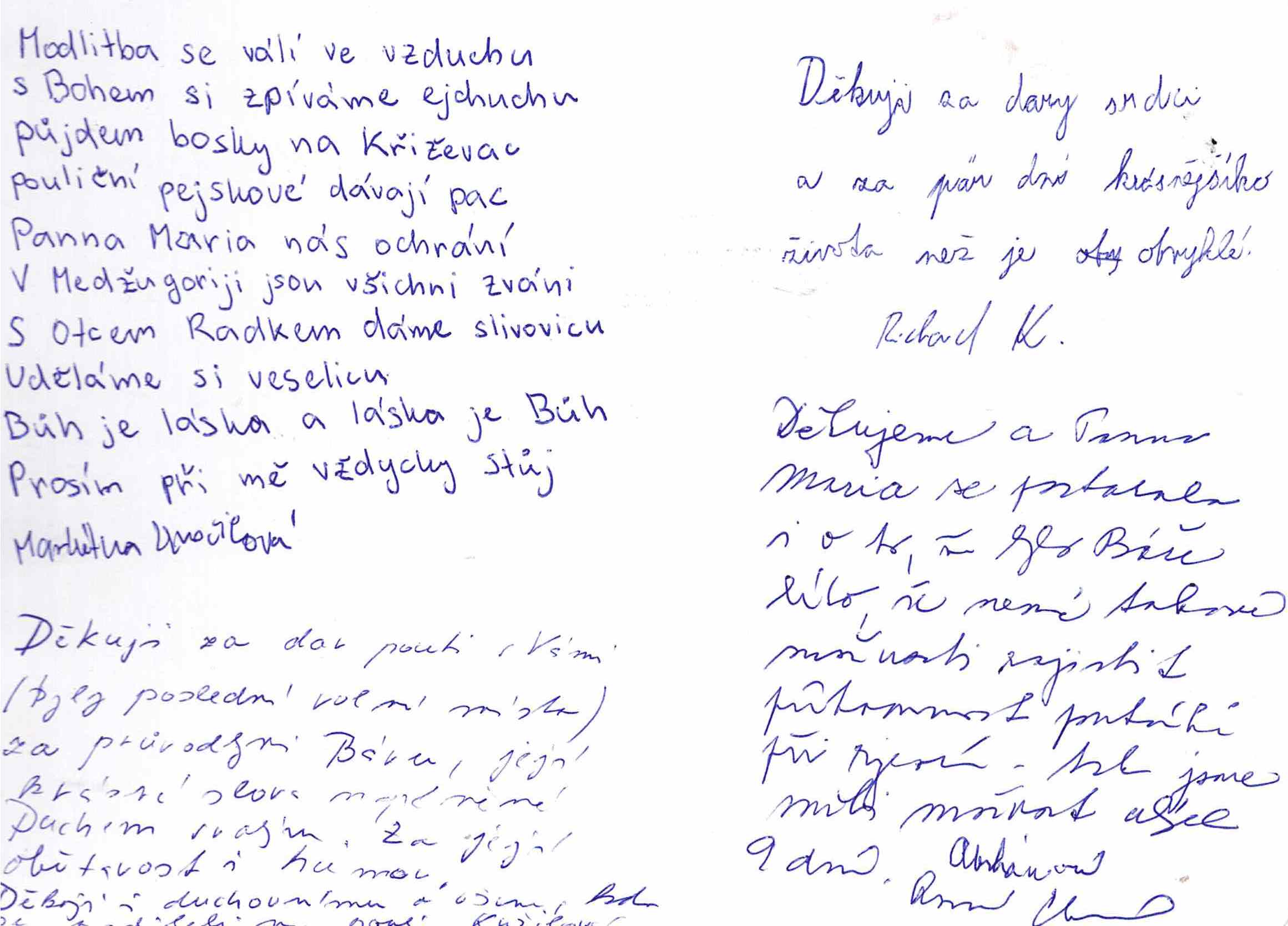 Ještě jednou bych Vám ráda poděkovala za skvělou pouť do Medjugorje. Když na to myslím, vnímám velkou radost a vděčnost. Ať Vám Pán žehná a Panna Maria ať Vás chrání a drží ochranný plášť nad vaším společným dílem.