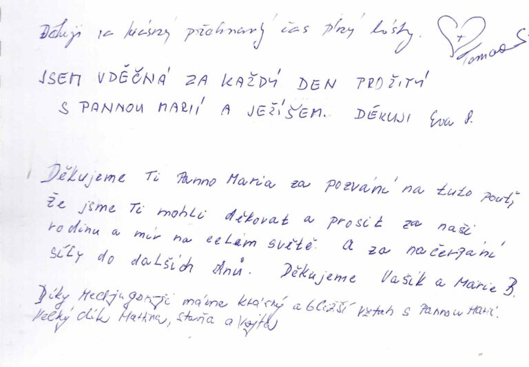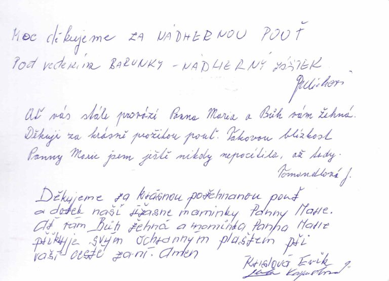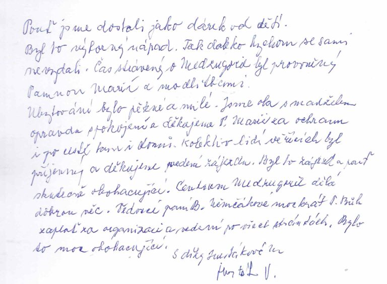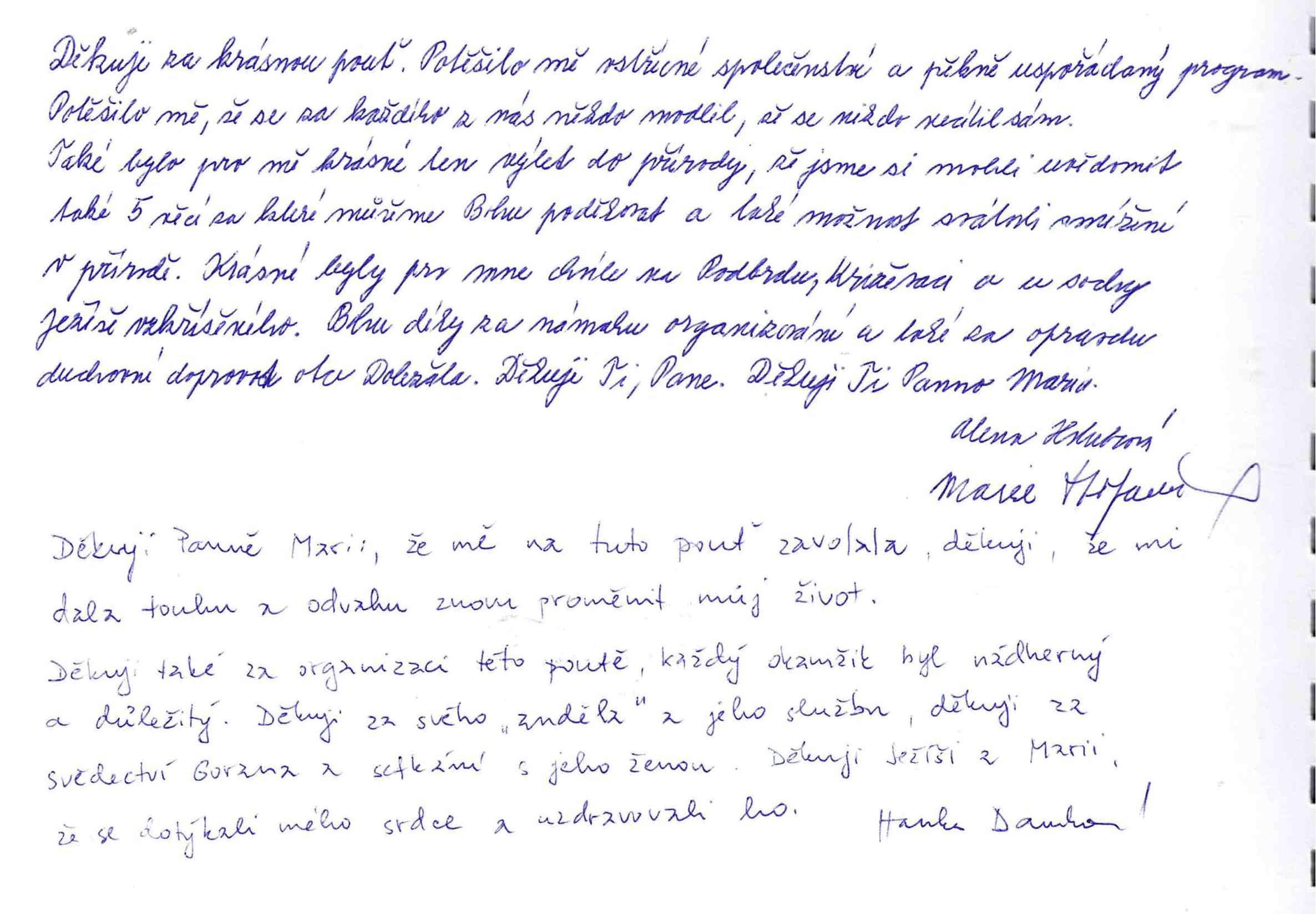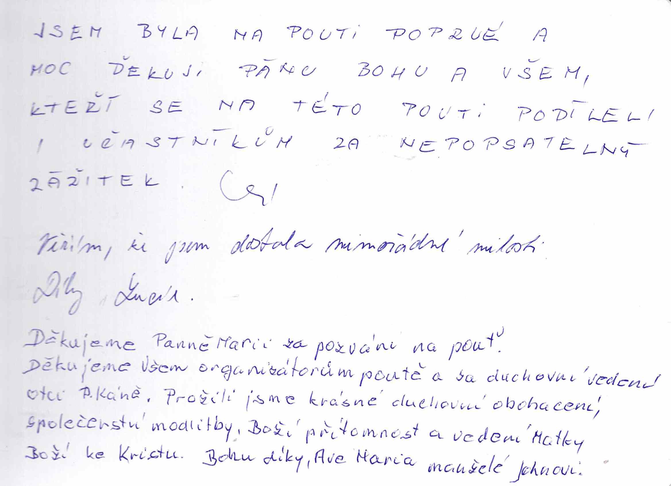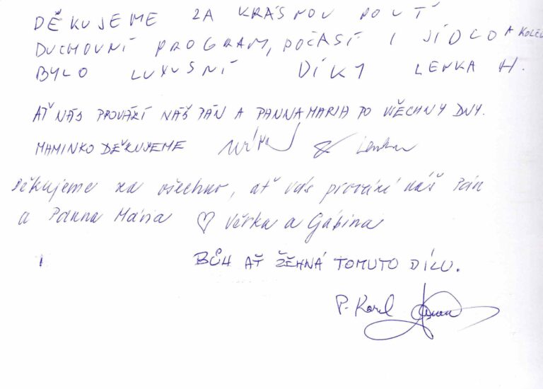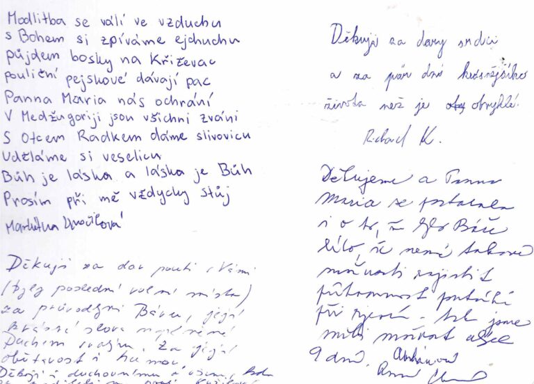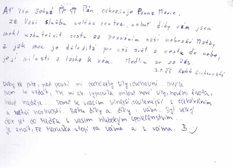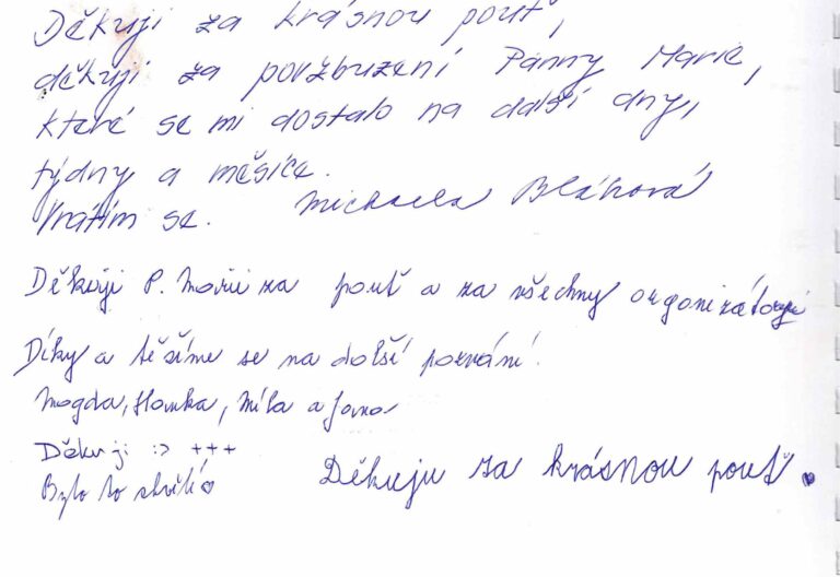 Ještě jednou bych Vám ráda poděkovala za skvělou pouť do Medjugorje. Když na to myslím, vnímám velkou radost a vděčnost. Ať Vám Pán žehná a Panna Maria ať Vás chrání a drží ochranný plášť nad vaším společným dílem.