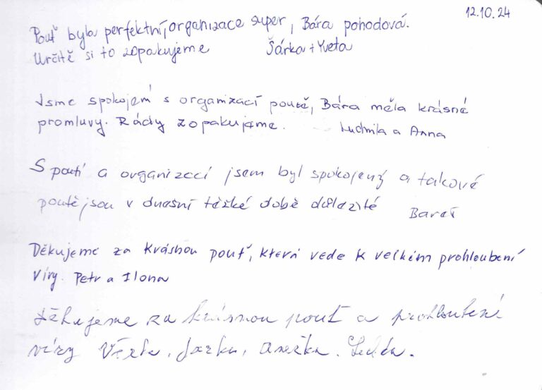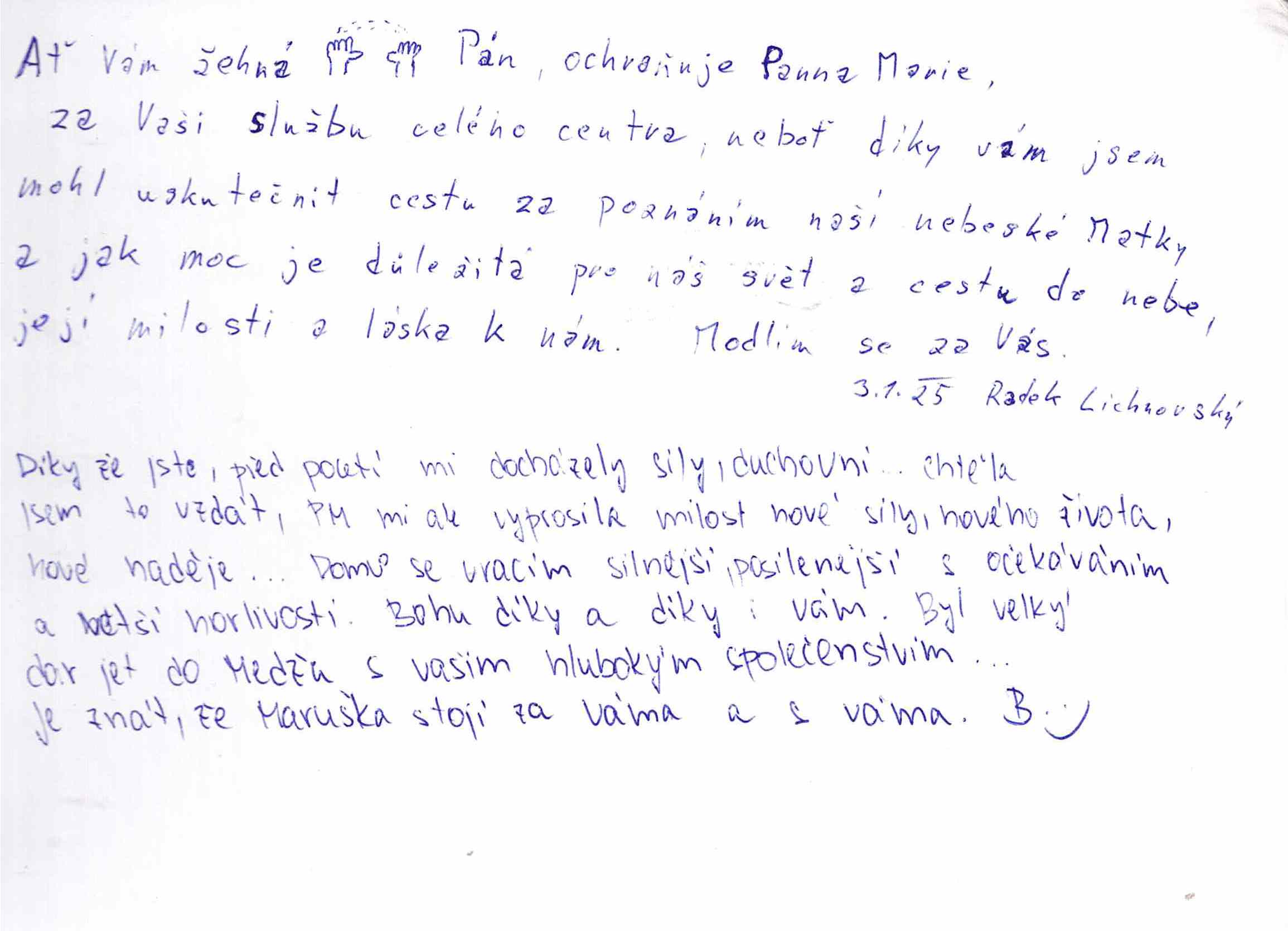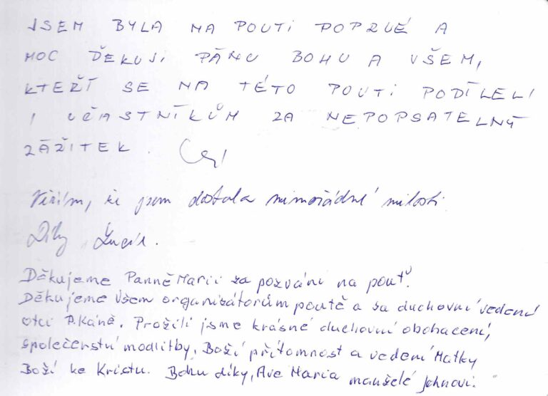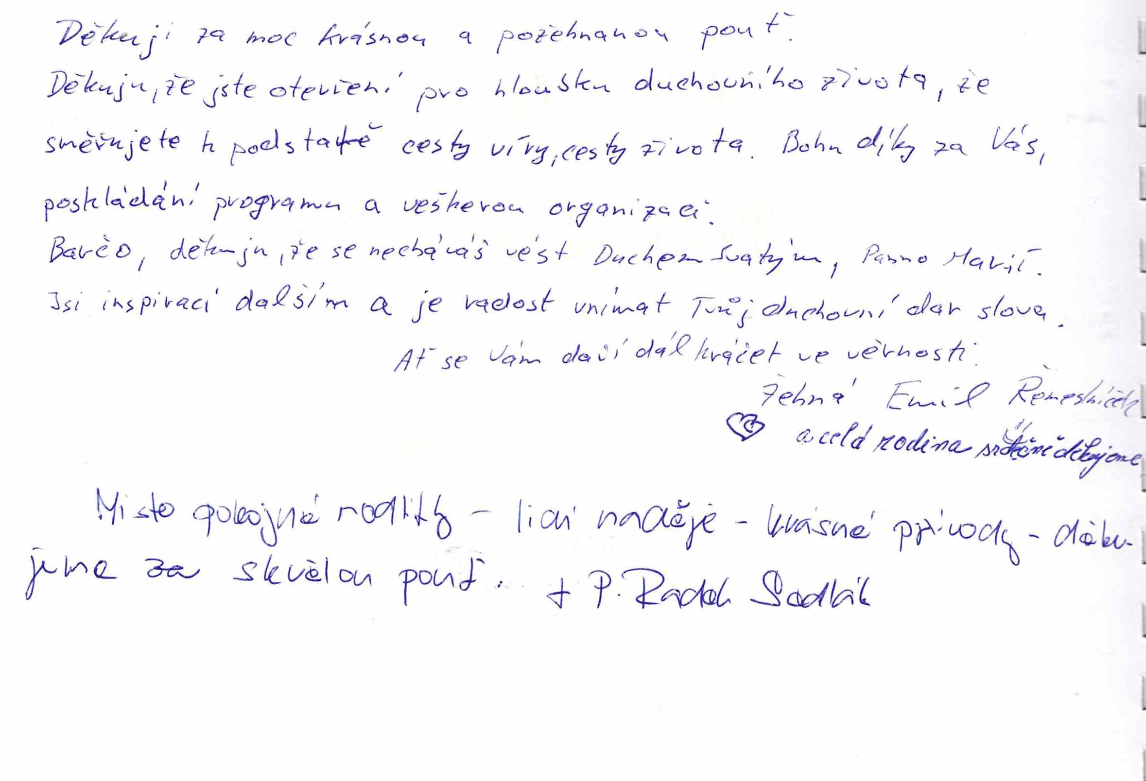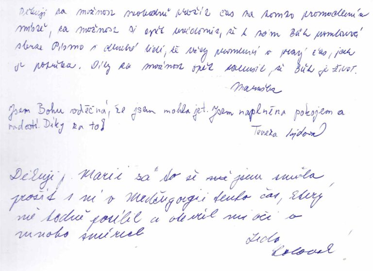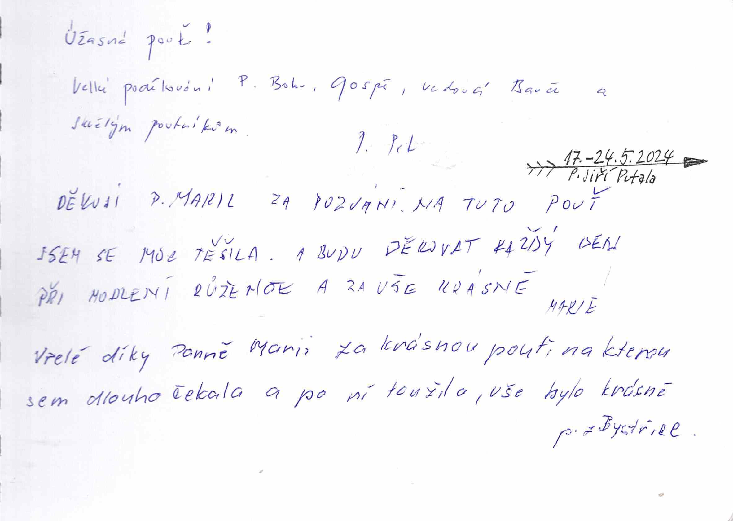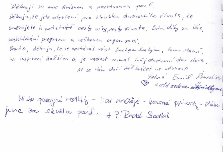 Ještě jednou bych Vám ráda poděkovala za skvělou pouť do Medjugorje. Když na to myslím, vnímám velkou radost a vděčnost. Ať Vám Pán žehná a Panna Maria ať Vás chrání a drží ochranný plášť nad vaším společným dílem.