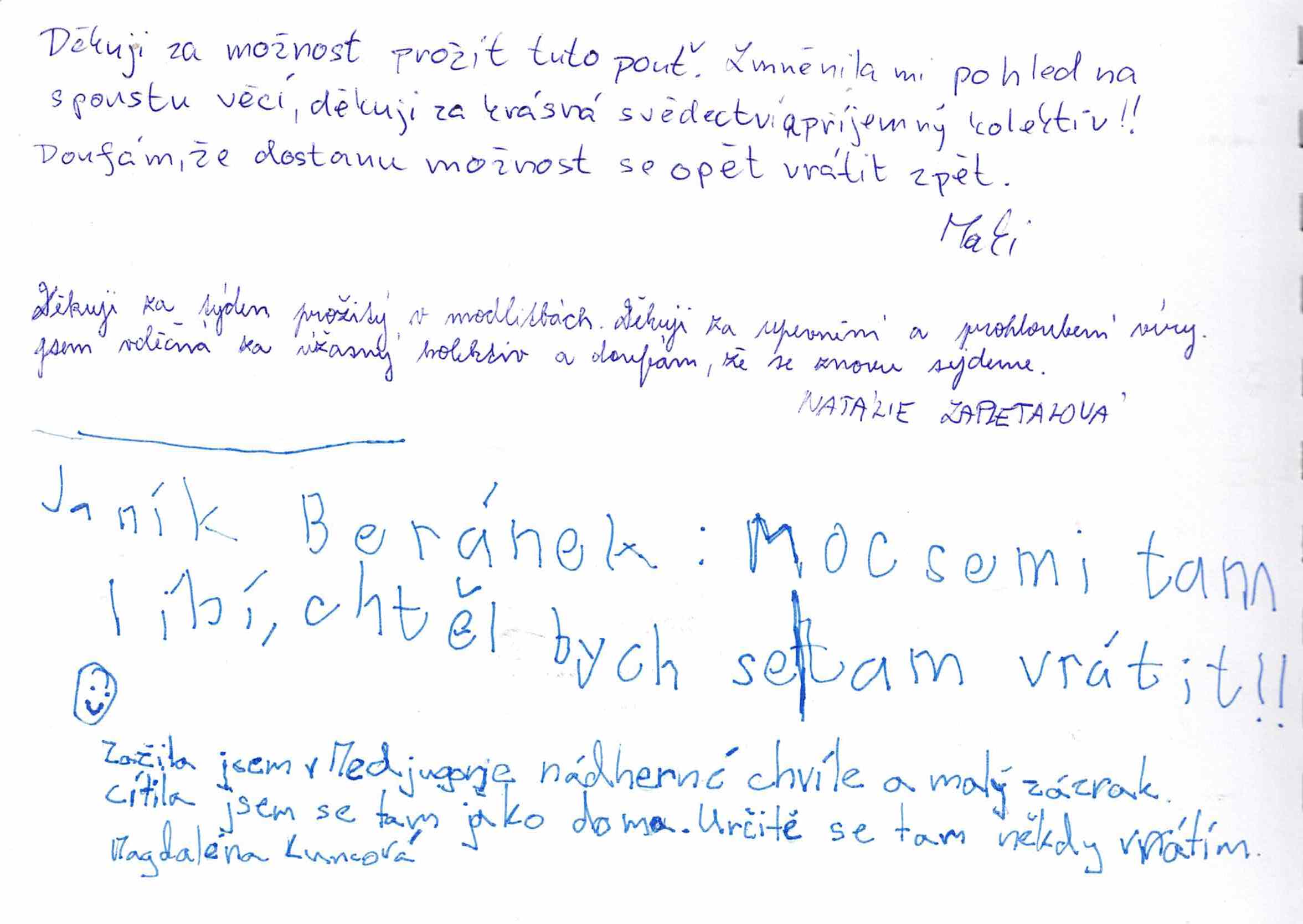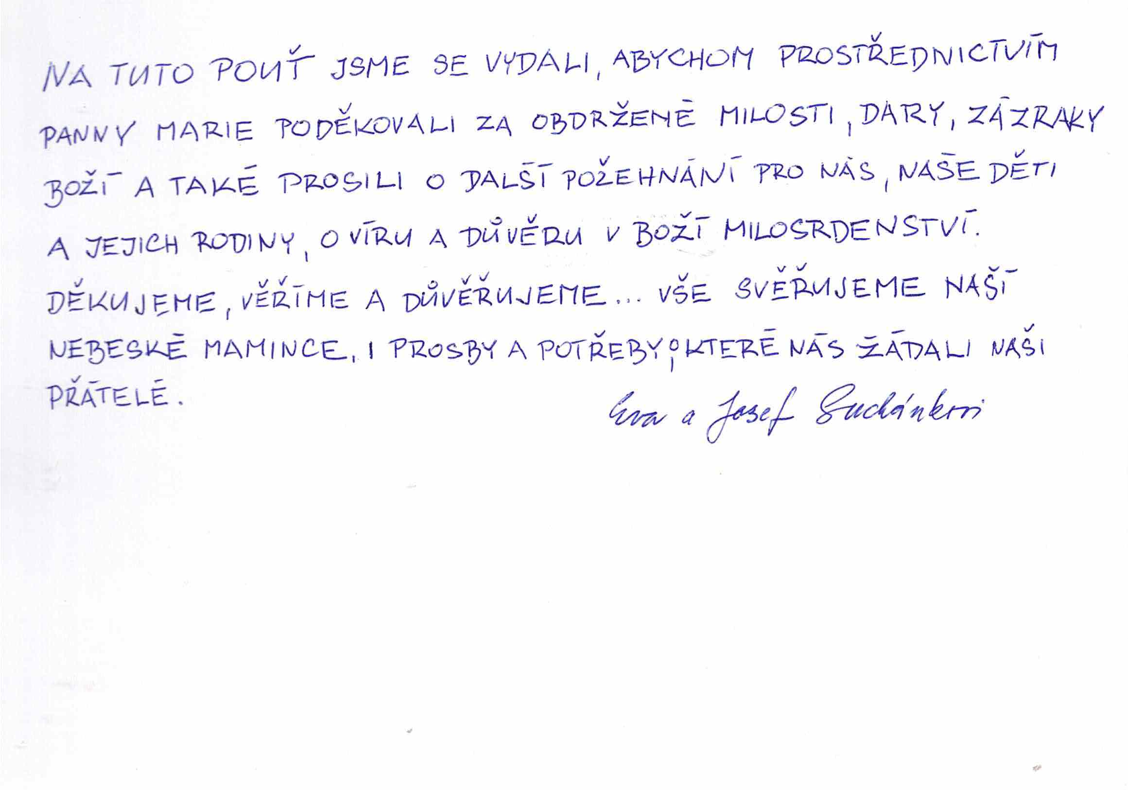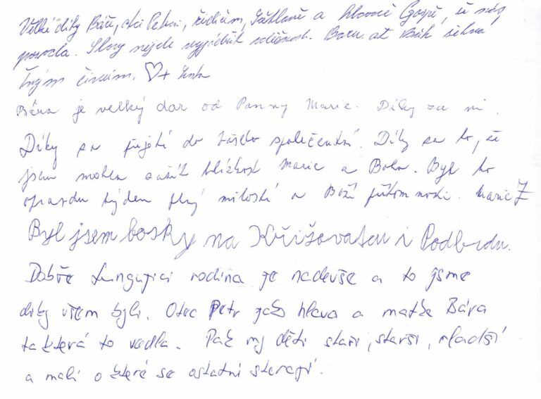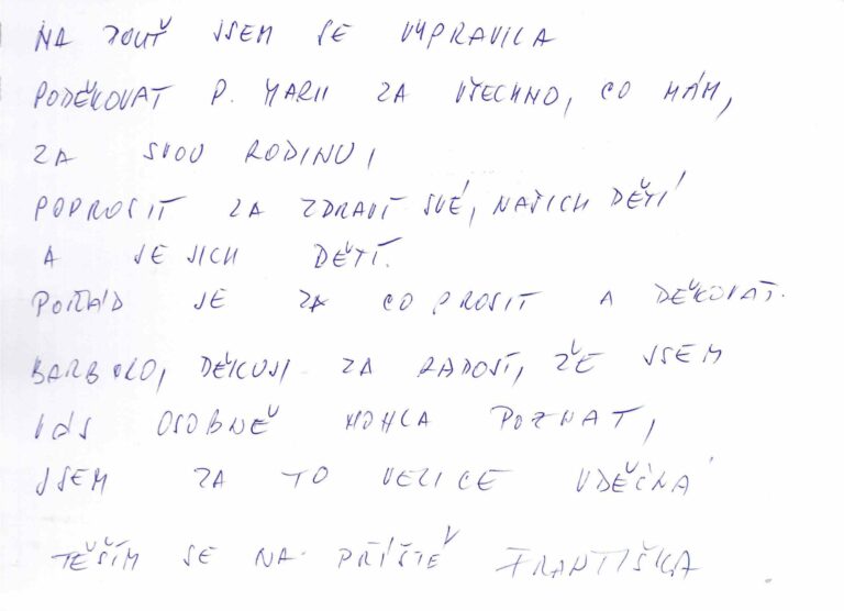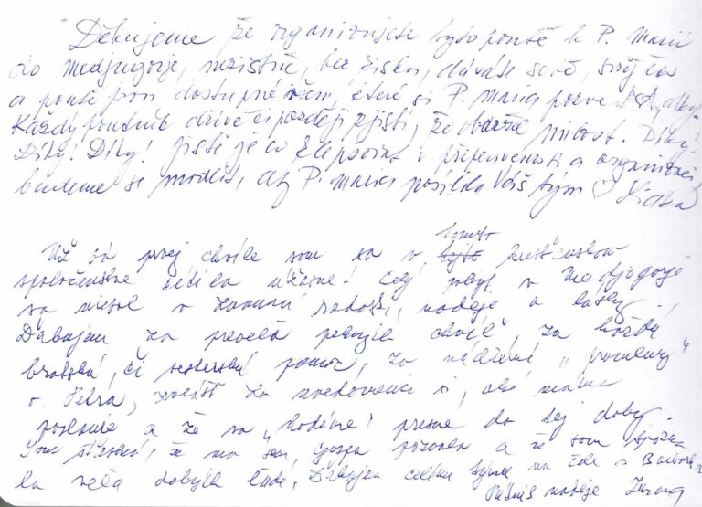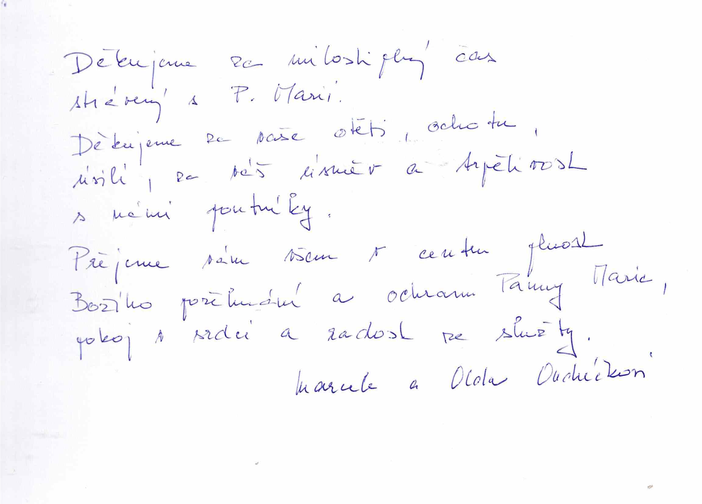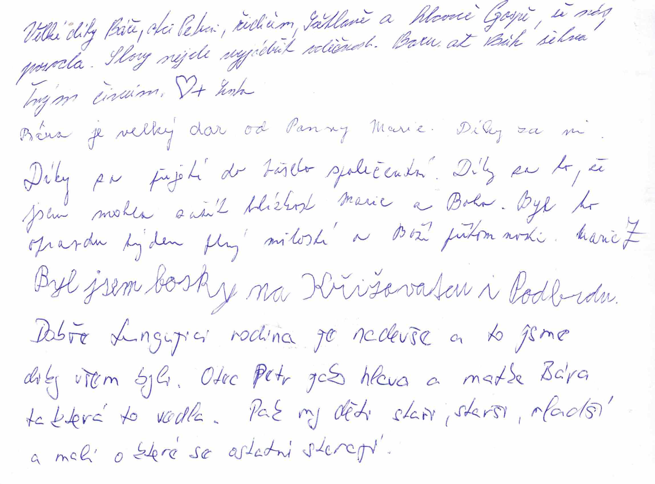 Ještě jednou bych Vám ráda poděkovala za skvělou pouť do Medjugorje. Když na to myslím, vnímám velkou radost a vděčnost. Ať Vám Pán žehná a Panna Maria ať Vás chrání a drží ochranný plášť nad vaším společným dílem.