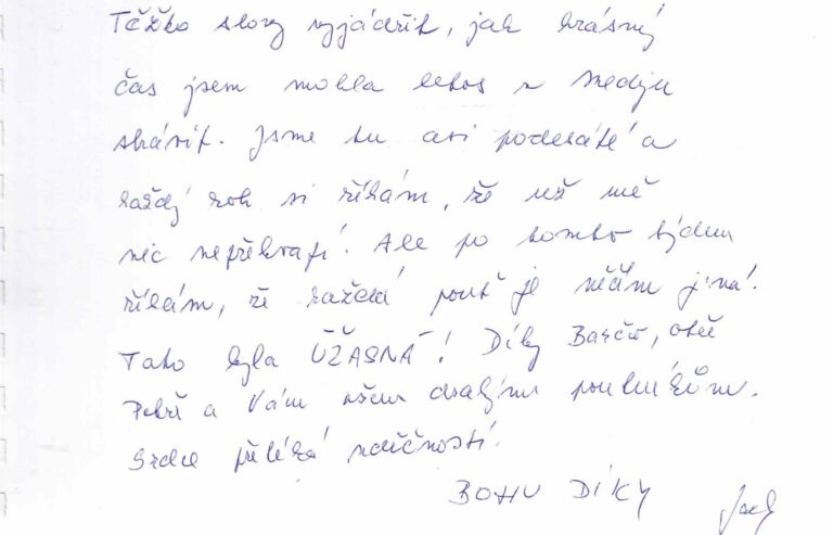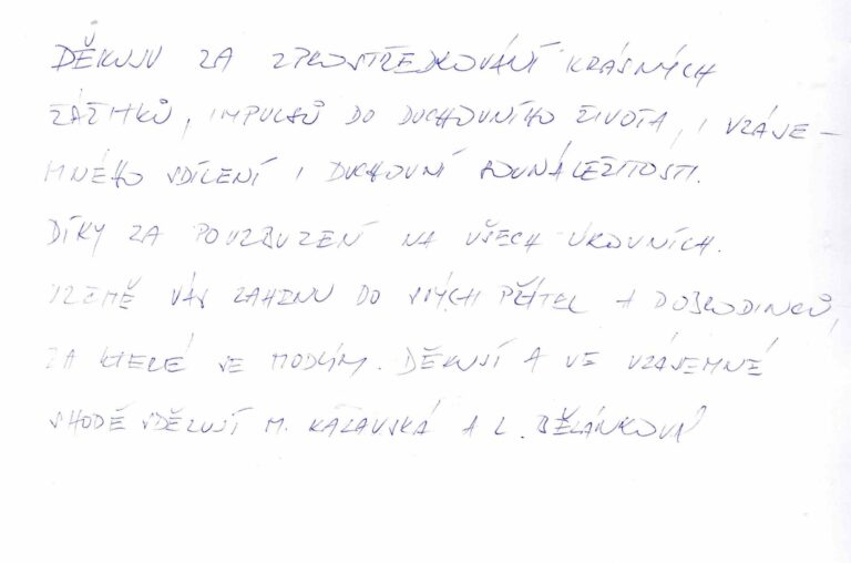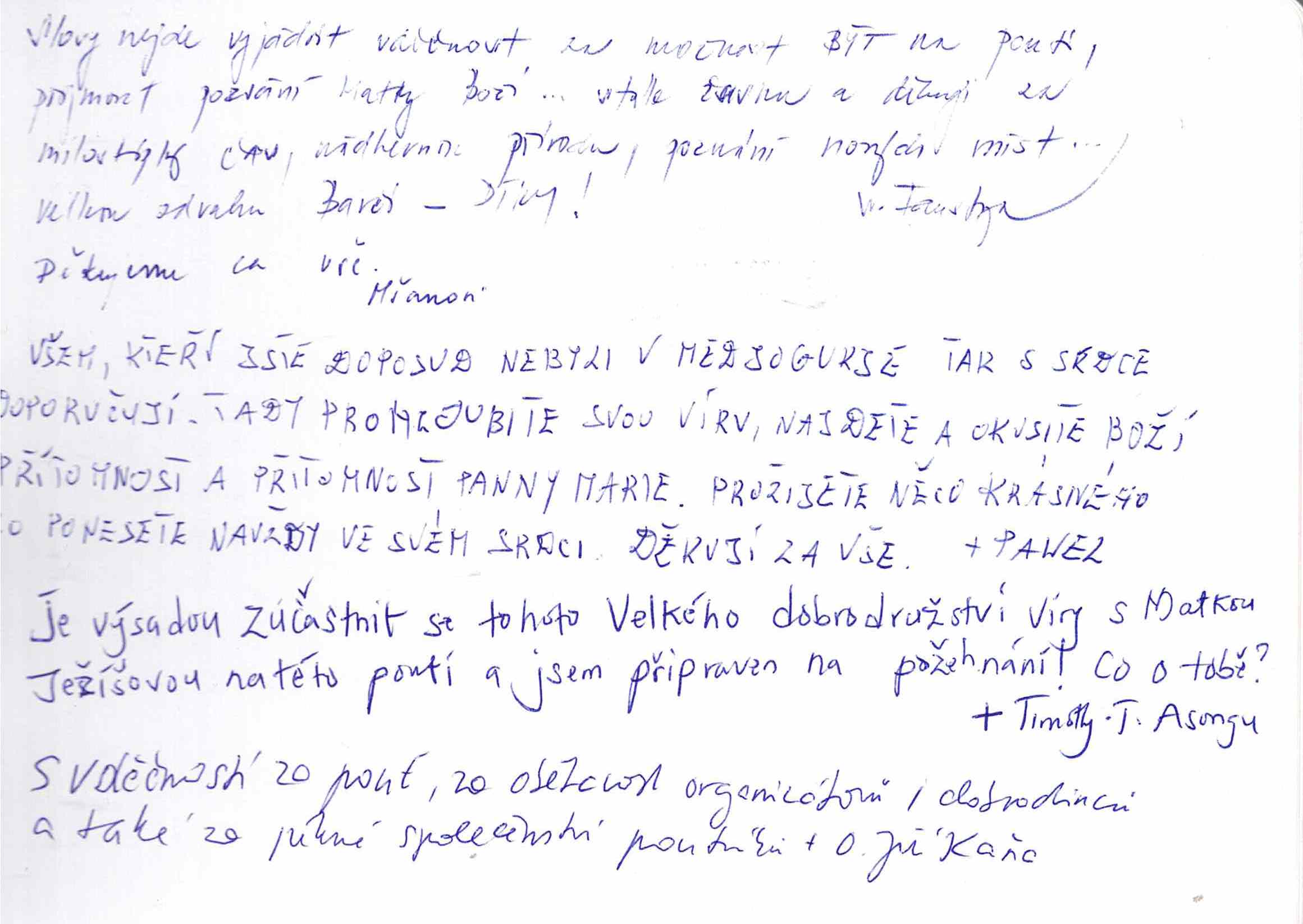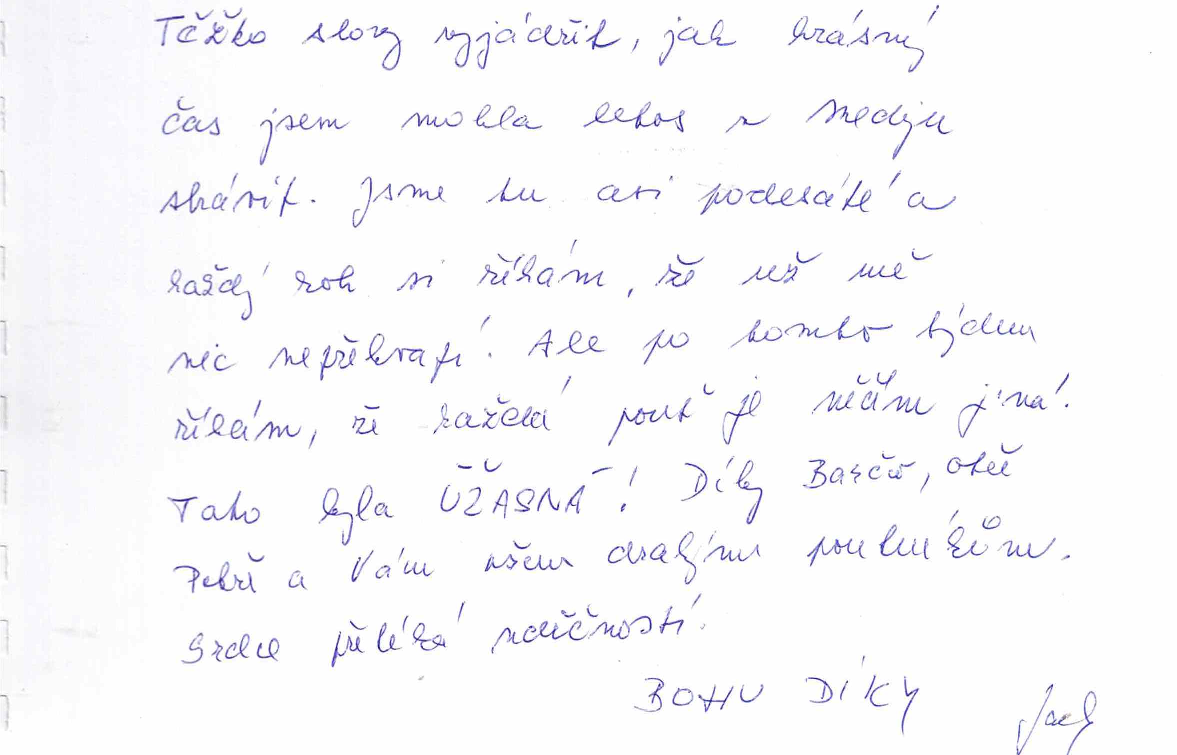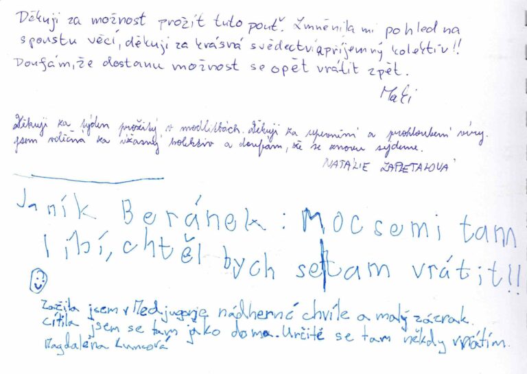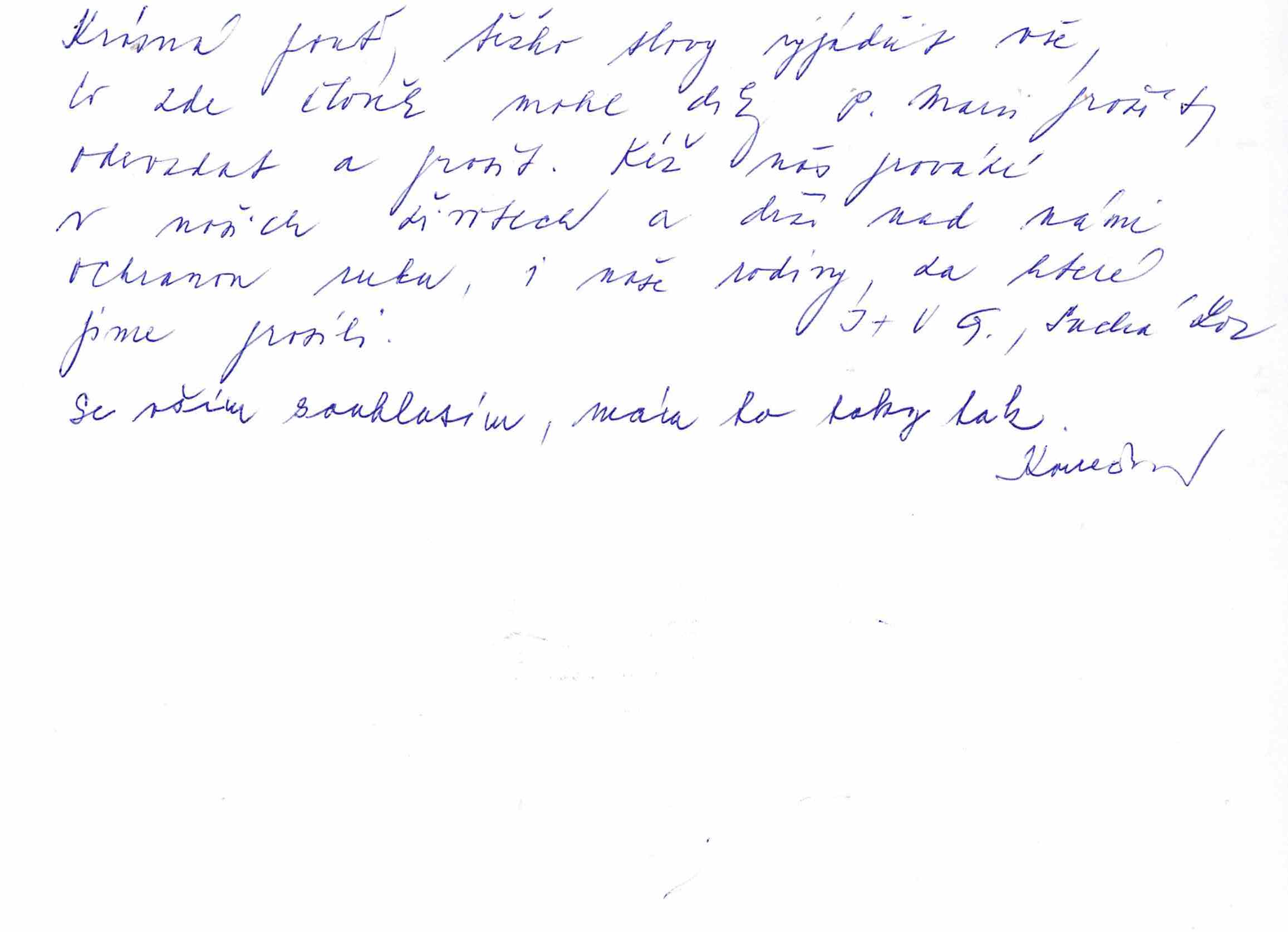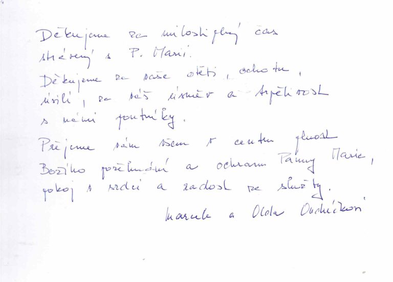 Ještě jednou bych Vám ráda poděkovala za skvělou pouť do Medjugorje. Když na to myslím, vnímám velkou radost a vděčnost. Ať Vám Pán žehná a Panna Maria ať Vás chrání a drží ochranný plášť nad vaším společným dílem.